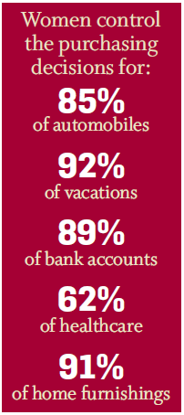 In a Chicago Tribune interview in May 2006, Michael Silverstein, author of “Trading Up,” stated that women not only control 100% of the discretionary family income, but they will earn more than the average man by 2030. (So much for equal pay.) Given the $5 trillion women spend annually in areas like new home purchases, healthcare, consumer electronics, investments, automobiles, vacations and do-it-yourself projects, it’s no wonder most of today’s manufacturers and retailers understand the necessity of marketing to women.