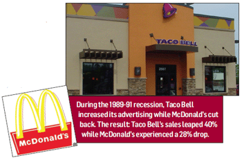 However, plenty of other companies saw growth during recessions. During the 1989-91 recession, a MarketSense study found that the following companies increased sales by the following percentages: Jif peanut butter (57%), Kraft salad dressing (70%) and Pizza Hut (61%). So how did they do this? Each increased their advertising during the recession. Now watch this: Taco Bell also increased its advertising and raised sales by 40%. At the same time, its competitor, McDonald’s, cut back on advertising and witnessed a 28% drop in sales.