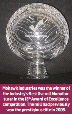 Mohawk Industries as the company was named the Best Overall Manufacturer in the 13th Award of Excellence competition. This was the second time in the competition’s history Mohawk took top honors, having initially won in 2005. The mill’s
