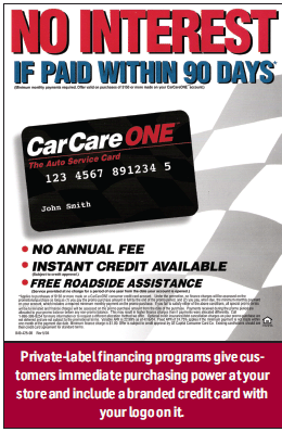 The advantage of any private-label credit card program or sales finance contract is that the credit line made available to your customers helps to drive future purchases to your store. An added benefit is that monthly billing statements can become a powerful advertising vehicle through the inclusion of statement messages and direct mail offers and inclusions.