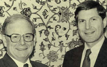 This photo was taken in March 1988, when Howard Brodsky, right, of Dean’s Carpet in Manchester, N.H., congratulated Emile D. Beaulieu on his election as mayor of the city. The twist: Beaulieu (what are the odds he would be in the carpet business with that name?) was a floor covering retailer who began his career in 1948 working for Harry Brodsky at Dean’s as a mechanic. A decade later, he opened Beaulieu’s Floor Coverings and in 1984 sold it. He then entered politics and the rest is history.