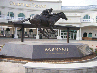 Barbaro, born on April 29, 2003, was owned and bred by Gretchen and Roy Jackson at Leal Stables in West Grove, PA. Sadly, the beloved thoroughbred suffered a severe leg injury just two weeks after his Kentucky Derby win while attempting to take the second leg of the famed “Triple Crown” in the Preakness Stakes. Despite several surgeries Barbaro never made a full recovery and was put to rest on January 29, 2007. In keeping with the long-time tradition of burying the head, hooves and ashes of a true racehorse, Barbaro was interred beneath the statue of his likeness in full-stride at the Gate 1 entrance adjacent to the Churchill Downs Museum.