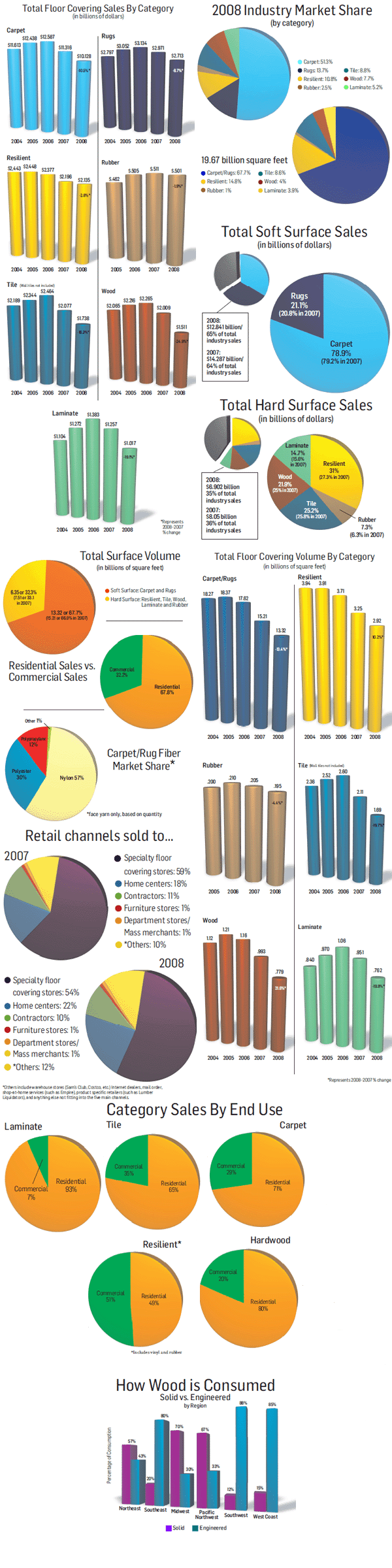 2008 flooring industry statistical information for floor covering sales by category, market share, soft and hard surface sales, total volume by category, total surface volume, retail channels sold to, category sales by end-use, resilient product breakdown, and how wood was sold.
