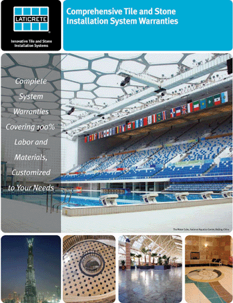 June 29, 2009- LATICRETE, a global leader in the manufacturing of innovative systems for the installation of tile and stone, has announced the launch of a newly enhanced warranty program that simplifies the wide array of warranties currently offered on LATICRETE products for architects, specifiers and tile contractors. The simplified comprehensive tile and stone installation system warranties are customized to meet the needs of LATICRETE customers for both residential and commercial tile and stone projects, offering system warranties that cover 100 percent of labor and materials. The following LATICRETE corporate system warranties are now in place for North America and can be found at www.laticrete.com under the “Contractors” header by clicking on the “Warranties” link: LATICRETE® 5 Year System Warranty, LATICRETE 10 Year System Warranty for Steel or Wood Framed Exterior Facades, LATICRETE 25 Year System Warranty, and the LATICRETE Lifetime System Warranty.