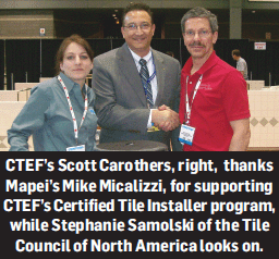 He added beyond knowing what a professional installer can mean to a job, Mapei is “happy to host the program” at its Technical Institute here because it is run by CTEF, an independent organization. “This [program] is a step in the right direction that has been a long time coming.”