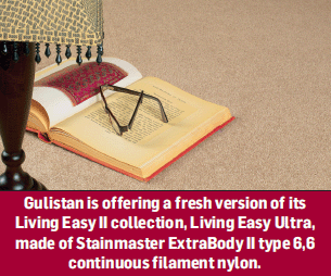 Leveraging the success of its Living Easy II, Gulistan is offering (as a third new texture) a fresh version of Living Easy II called Living Easy Ultra. It is made of Stainmaster ExtraBody II in a heavyweight construction.
