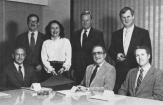 In April 1986, BASF Fibers held a series of road shows offering previews of the latest trends in contract carpet styling. At this event, those in attendance were, standing from left, Mike Brigman, Deborah Adams, Tom Fischel and Clint Easton of BASF; seated, same order, are Howard Elder, Bill Burr and Jim Jolly of J&J Industries.