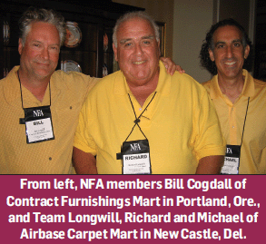 • NFA is looking at another inventory purchase as a group. “We are trying to funnel some very competitively priced carpets, backed up with the promise of a substantial increase in business,” Macco said. “First we approach the members and ask what price point, which fiber, which type of carpet would be key to their success. Then we approach the vendors with a specific commitment of rolls and see who will give us the best deal. We hope to place that buy at Surfaces.” The last such deal was to the tune of 2,700-plus rolls and $5 million, which has brought more mills to the bargaining table this time, Macco said.