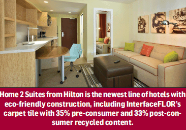 After touch down, the traveler could find himself staying in Home2 Suites, the newest hotel brand from Hilton, which is also outfitted with Interface’s carpet tiles. The new hotel is a mid-tier, eco-friendly lodging option that targets value oriented, extended-stay guests. The prototype in Memphis, Tenn., is the first, but franchise applications are in for New York City, Baltimore, Charlotte, N.C., and San Antonio, including others. It is anticipated there will be 100 properties open by 2012.