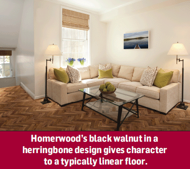 Homerwood followed Armstrong’s lead with its Herringbone Cut Planks in hickory, black walnut, cherry, hard maple, white oak and red oak. “With this customization, you can add character to a room,” said Dawn McElfresh, product manager. Handscraped by Amish craftsmen, it has a UV-cured oil finish conducive to refinishing and repairs. It will be available in March.