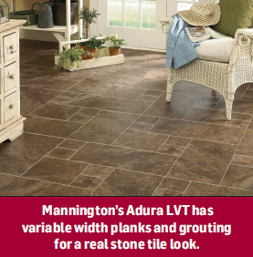 The mill has two new releases, Sobella Omni HD and Adura LVT. Sobella is a fiberglass-backed sheet vinyl with visual imitations 200 times sharper in deeper, richer colors than prior capabilities, Mannington claims. In seven patterns, 30 SKUs, its thickness makes it very comfortable underfoot, said Paul Mixon, manager of resilient business.