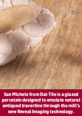 San Michele is a glazed porcelain featuring Microban antimicrobial protection. The collection emulates natural antiqued travertine through Dal-Tile’s Reveal Imaging, a new technology that creates dimensional, sophisticated graphics with rich coloration, texture variation, clefting and veining, noted Rolley. “Reveal Imaging allows tile graphics to be much more realistic than traditional methods of printing with no two tiles alike.”