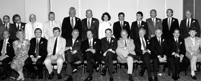 | | The name game. This photo was taken on July 15, 1989, at a dinner by the Anti-Defamation League honoring Larry Nagle. The industry executives shown here were part of the dais for the event. Here’s the challenge: By posted mail, email or fax, identify as many of the 24 people in the photo as you can. Whoever gets the most correct wins. The prize: A surprise. But the winner will love it. Now, get out the magnifying glass and get to work. |