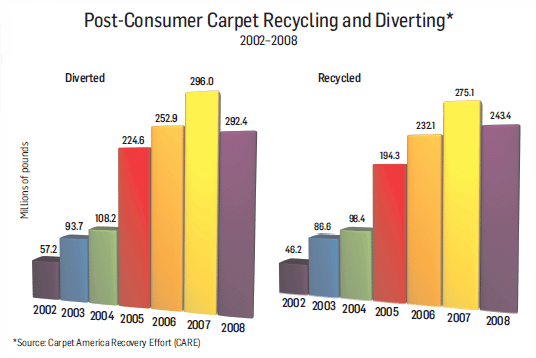 What exactly does that mean? Looking at 2008, the most recent year’s available figures, 243.4 million pounds of carpet was actually recycled, while 292.4 million pounds was diverted to other uses, many of which CARE has helped develop through education, coordination and recognition.