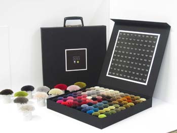 Colors featured within the 2011 collection include luxurious shades of white— delicate iced pastels, classic neutrals, sophisticated naturals, chic mid-tones, rich and exotic earth shades, fashionable vibrant brights and deep mysterious darks. These colors are presented in poms (or available on fan cards) dyed on Laneve™ New Zealand wool.