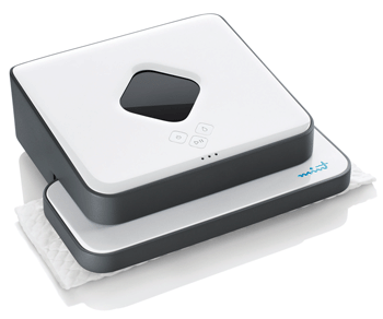 It also has the ability for wet and dry cleaning, depending upon the cloth used. With wet cloths, the robot uses a mopping motion to dissolve dirt, whereas with dry cloths, it captures the dust, dirt and hair that settle on the floor. Pirjanian added sensors keep it from carpets and rugs, and adjusts friction dynamics on hard surfaces, similar to dynamic stability control in a car.