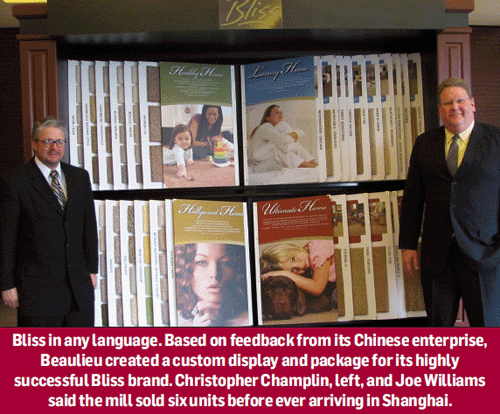 Beaulieu of America chose not to exhibit at DACF, the company, which already has a presence in high end retail outlets in 44 of China’s cities, set up shop 10 minutes from the event at the Parkview Hotel with a tailor-made display and product line under its successful Bliss brand.