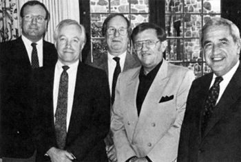 | | Back in 1987, Allied Chemical held biennial road shows and in November of that year invited the participating retailers to The Farm, the company’s local retreat. Shown here are, from left, John Lomicky of J.M. Benson; Bob Levison of Allied; Howard Agid of New England Carpet; Herb Wolk of Cadillac Carpets, and Sam Prizant of Prizant’s Carpets. That was 23 years ago and so much has changed. |