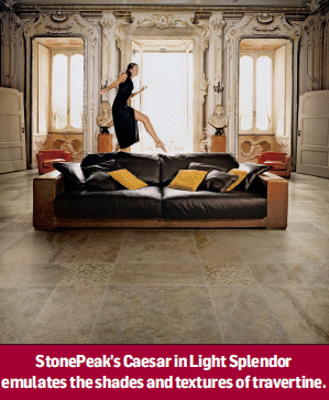 Caesar emulates the shades and textures found in natural travertine while avoiding any repetition in design due to StonePeak’s inkjet technology, he noted. Caesar is available in four natural shades and comes in four sizes—24 x 24, 12 x 24, 18 x 18 and 12 x 12—and complemented by a complete trim package including mosaics and chair rail.