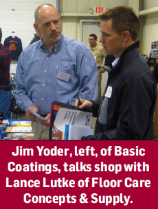 The Dustless Refinishing & Refinishing Handscraped classes, taught by Jim Yoder and Enos Farnsworth of Basic Coatings, featured the company’s Tykote dustless refinishing system for prefinished and previously finished floors of all types, while the handscraped session, presented by Ceno’s Bob Moffett and Erickson’s Rob Landback, showcased Ceno’s Satellite buffer system with dust containment “as a quick, efficient way to refinish all types of finished floors.”