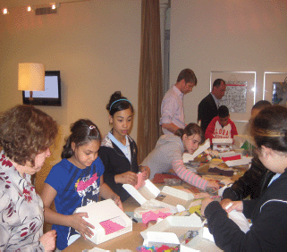 They partnered with designers, whose firms donated carpet sample boxes, carpet samples and a variety of design materials. Students worked alongside designers to decorate the boxes with carpet samples and other materials, repurposing the boxes as containers for art supplies.