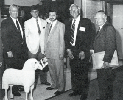 During the 1987 summer market in Atlanta, these men were looking for Little Bo Peep, who was on the lamb, to coax this sheep out of the picture. In the showroom of Carpet Industries of North America CINA, are, from left, Jack and Tom Love of Love International; Sid Schwartz of CINA, and Tom Sandifer and Rufus Ashby of Cain & Bultman. Schwartz commented: “We raised the baaaa and no one got fleeced”.