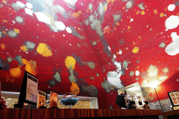 The colourful carpets in the office’s restaurant are based on Birza’s depictions of underwater realms, with the acoustic performance of having carpet on the walls also resulting in a subdued and intimate atmosphere.