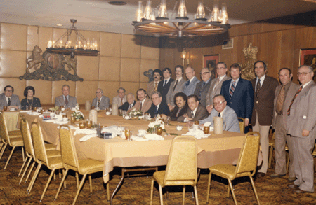 This photo was sent in by Howard Gottesman, who wrote: “I just found this picture taken at my first job, which was with Empire Carpet Corp. It was circa 1975 and the company was honoring a retiring salesman.” Seated, from left, is Walter Charchalis, vice president; Marjorie something; Frank Hoylman Jr., president; Sam Futterman, vice president; Jack Stabile, sales manager; Dave Levine, the retiring salesman being honored at the dinner; next two unknown; Alan Rodriguez, and two more unknown. Standing, from left, are Vincent something; unknown; Howard Gottesman; Dick something, credit manager; and the rest are unknown except for Stew Hollander, who is third from the right. As usual, any identification of the unidentified will be greatly appreciated.