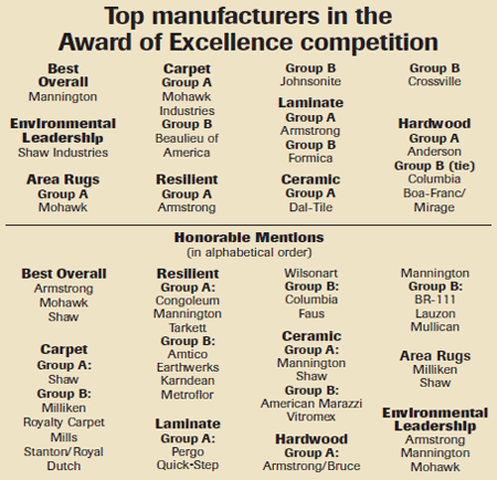 Mannington Mills is back on top as Best Overall Manufacturer in the 14th annual Award of Excellence competition. This was the ninth time Mannington took top honors, which it last annexed in 2006.