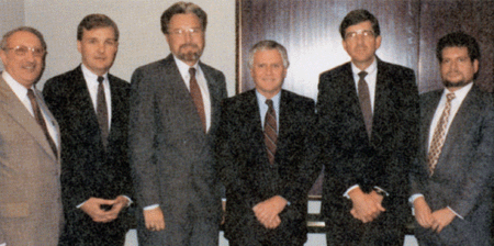 The Retail Floorcovering Institute (RFI) held a meeting in New York City in September of 1987 and it endorsed, recommended and supported dealer participation at all markets. All market centers were represented at the meeting, which participants hoped would keep the events viable and thriving. At the meeting, from left, were Lou Spano of Eldorado Floor & Wall Co., president of the RFI; Brad Hoover of the Dallas Market Center;