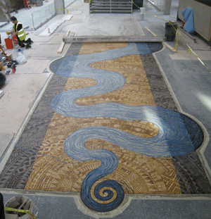 LATICRETE, a global leader in the manufacturing of innovative systems for the installation of tile and stone, has continued its support of the fine arts community by donating two of its premium installation products for award-winning, London-based mosaic artist Gary Drostle’s latest masterpiece commissioned by the University of Iowa. Drostle’s “River of Life” mosaic art mural was one of the key architectural elements of its new $59 million Campus Recreation and Wellness Center for its flagship location in Iowa City.