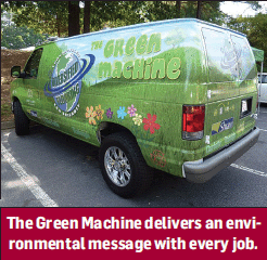 The environmental commitment story is told via the Green Machine, a van replete with a canopy, table and chairs. Potential customers receive information and demonstrations about the type 6 cradle-to-cradle story, durability of nylon and Shaw’s proprietary stain resistant treatment, R2X.