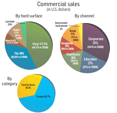 FCNews estimates carpet remains the runaway market share leader at about 63.7%. But sales nosedived to between $2.1 and $2.2 billion in 2009 (Main Street sales accounted for an additional $650 to $750 million). Corporate applications represent the bulk of commercial carpet sales (45%) followed by education (15%) and hospitality and healthcare (10% each). Observers say education and healthcare are considered the two fastest growing sectors, driven largely by higher school enrollment nationwide and an aging U.S. population, respectively.