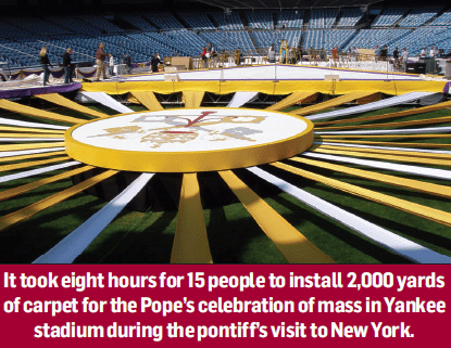 For which part of the Pope’s visit did you provide carpet?We provided gold carpet for his visit to St. Joseph Seminary in Yonkers, N.Y.—the gold cross was so big it could be seen from commercial airliners flying overhead—and white carpet for the celebration of Holy Mass at Yankee Stadium.