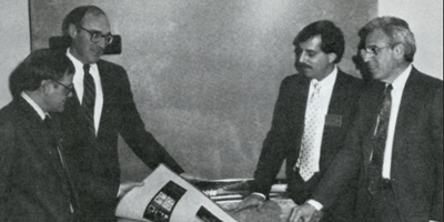 Stainmaster collection to a trio of DuPont executives. In the photo, from left, are Bob Axtell, Tom McAndrews and Ed Berman. Stainmaster was relatively new; DuPont introduced the breakthrough technology in the fall of 1986.
