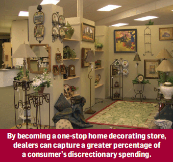 Product mix varies depending on the market and the particular dealer. Often times, that retailer’s motives dictate the add-ons to his or her store. “I was bored with ‘fuzzy-side-up’,” Fried explained. “I started to check out other stores that were already [diversifying products] and I started to do research, calling vendors from furniture and window treatment companies.” Ultimately, she chose to sell window treatments, accessories and decorative home pieces like vases, mirrors, cocktail tables, benches, paintings, sconces and throw pillows.