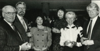 In February 1989, the Floor Covering Industry Foundation (FCIF) held its annual banquet during the Atlanta winter market and most industry leaders turned out. Shown here during the cocktail hour are, from left, Emmett Dineen of the International Design Center of New York (IDCNY); Chas Sydney, Michele Tedder and Donna Sydney of the Atlanta Mart; Jen Dineen, and Wade Newman of the National Association of Floor Covering Distributors (NAFCD).
