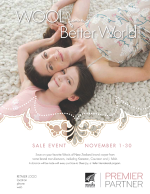 MARIETTA, GA, August 20, 2010—This November, homeowners getting ready for the holiday season will have extra incentive to choose branded Wools of New Zealand carpet and rugs thanks to Wool for a Better World™, a four-win program designed to benefit consumers, Premier Partner retailers, wool carpet manufacturers and the Shear Joy organization.