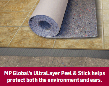 MP Global has one of the leading new acoustic products, marketed under its UltraLayer Peel & Stick label. UltraLayer Peel & Stick, made from 100% recycled content, is an underlayment that insulates, deadens sound and suppresses lateral cracks. Jack Boesch, director of marketing, said specifiers are using the UltraLayer products for condominiums and apartments because of its excellent sound-deadening qualities.