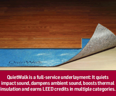QuietWalk not only quiets impact sound (footfall noise) into the space below, but it also dampens ambient sound in the room in which it is installed, and inhibits airborne sound such as stereo, TV, voices, etc., from traveling down into the room below.