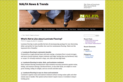 North American Laminate Flooring Association (NALFA) announced today the unveiling of its new website and blog at www.nalfa.com. The new and improved site features an entirely new look and feel, ease of navigation and simplicity in design, making it an educational and helpful resource for consumers who are in the laminate floor buying process.