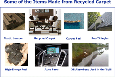 Recycling carpet in California also has the potential to eliminate over 9 million metric tons of greenhouse gases from the atmosphere. Products made from carpet recycling include new carpet, carpet padding, a wide range of building products and high-energy fuel. Governor Schwarzenegger recently signed a California carpet recovery bill which established the nation’s first comprehensive, industry-financed and supported mandatory carpet recycling program.