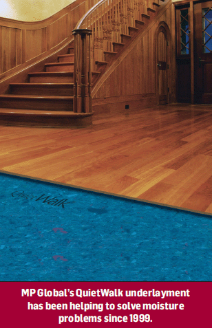 MP Global has added new features to its QuietWalk product, namely SAP, or super absorbent polymer, which increases absorbency and dissipates moisture. “QuietWalk will capture any water that works its way down around the perimeter of the floor,” Boesch said. When properly installed it will wick water and disperse it throughout the pad while the attached vapor barrier on the top will protect the flooring. “We call it a moisture management system.”