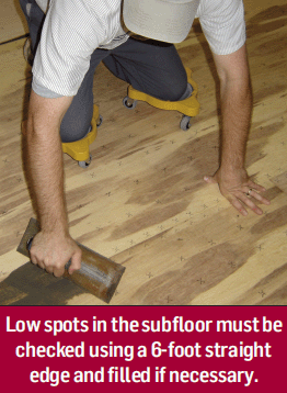 3. Subfloor preparation. Fill any low spots in the subfloor greater than 1/8-inch in 6 feet with a Portland cement leveling compound. Check this by using a 6-foot straight edge. Remove any high spots by sanding or grinding. Remove any existing floor molding except for the wall baseboards and make sure the floor is swept clean.