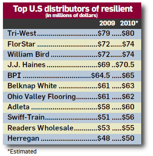 NRF Distributors in Augusta, Maine, showed flat sales for resilient in 2009 but a small increase so far this year. The category has been fueled by Mannington’s Adura LVT collection, most of which comes in the popular floating format. “We love that product,” said Terry Gray, vice president of marketing at NRF.