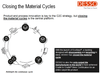 Encouragement Agency (EPEA), DESSO has become the first carpet manufacturer in EMEA to adopt the Cradle to Cradle® design. It marks DESSO’s radical decision to move beyond ‘mere’ sustainability in producing its carpets and artificial grass. In the Cradle to Cradle® principles, products are made from pure components that are easy to disassemble, in order to create new products (= up-cycling) in both the biological and technical cycles.
