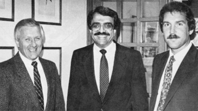 Back in the day, Allied Fibers held biannual Road Shows and invited hordes of retailers and distributors to attend the events. The shows included business meetings and fun sessions surrounded by fine dining and lots of bonding. Shown here at a November 1987 Road Show at the company’s “Farm” are distributors Roger Hunt, left, of Carson Pirie Scott; Chico Batavia, center, of LDBrinkman, and Denny Zeitz of Elias Wilf.