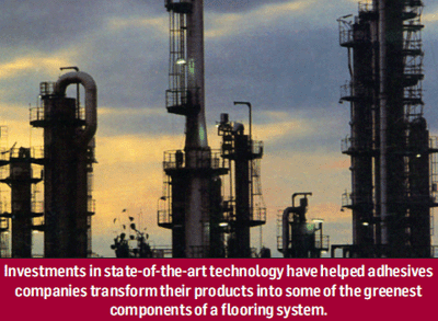 Though the adhesives segment didn’t need the prodding of environmental law, manufacturers note green regulations and standards have been beneficial to the industry as a whole. “The demand for environmentally friendly products has become ubiquitous in 2010,” said Larry Scott, technical director, DriTac, which has an entire family of green adhesives and concrete sealers that are zero VOC and solvent-free. “Low VOC products are the mandate and zero VOC, solvent-free products are more valuable and sought after than ever before.”