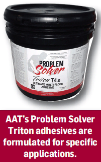 AATThe company’s pride and joy is its line of Problem Solver Triton Ultimate Adhesives, which combat the flooring industry’s toughest challenge: wet slabs and high alkalinity. “The Triton Ultimate adhesives are one-step, high performance adhesives,” said Greg Wood, president. “Each product is specifically formulated for specific applications, including VCT, carpet tile, vinyl sheet, rubber tile, rubber sheet, vinyl plank and broadloom over porous subfloors. The Triton adhesives bring to the flooring contractor advanced technology to handle concrete substrates with a high moisture vapor emission rate (MVER) and sub-floor relative humidity (RH) without the need for moisture mitigation coatings.”