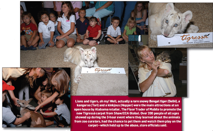 MOBILE, ALA.—Putting together an “open house” event at your store can be stressful in and of itself. Throw in a lingering recession, a rare Bengal tiger, a kangaroo and a kinkjous (a nocturnal tree-dweller from Central and South America) and the stress level rises exponentially in the hopes that not only will people show up but hopefully the animals will not destroy the store.